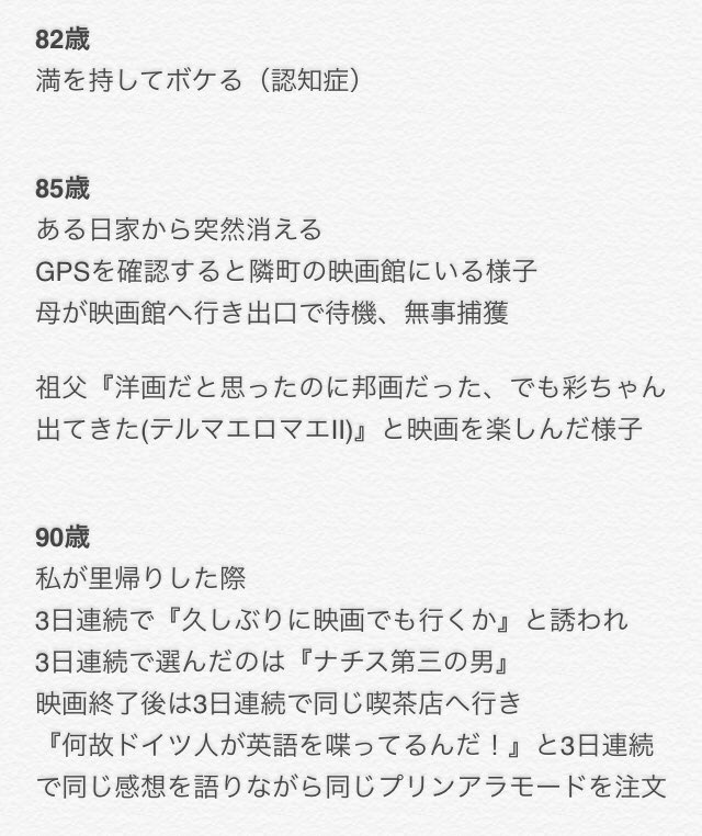 おじい様はもちろん、そのおじい様に寄り添い、3日連続で『同じ映画』『同じ喫茶店』『同じプリンアラモード』に付き合って下さった貴方も、素晴らしいと思います。