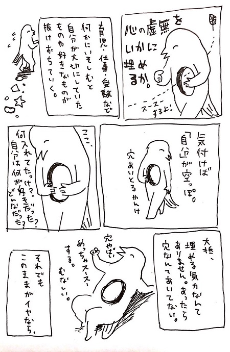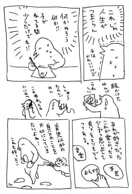 涙出ました。一生懸命子育てしたことをって後悔はしてないけど、自分を空っぽにするのはダメです。今年の春に下の子が大学卒業して社会人になったので自分の好きなものを思い出しているところ。私だけじゃないんだと知って涙が止まらない。描いてくれてありがとう。